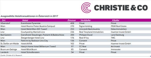 Wien. Nach einem ruhigen ersten Halbjahr mit lediglich 130 Millionen Euro Transaktionsvolumen hat sich in der zweiten Jahreshälfte 2017 einiges getan. So wurde über das Gesamtjahr gesehen mehr als eine halbe Milliarde Euro an Hoteltransaktionen registriert. Aufgrund der geringen Anzahl an Hotels, die sich am Markt befanden, hat sich die Nachfrage laut Hotelimmobilienspezialist Christie & Co in Richtung Kauf von Entwicklungsprojekten verschoben.