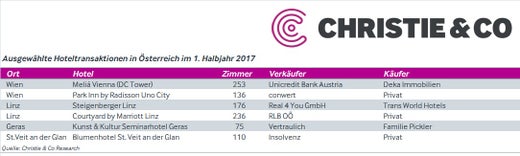 Wien. Mit knapp einer Milliarde Euro Transaktionsvolumen bei Hotelimmobilien ging das Jahr 2016 bisher mit einem Rekordergebnis in die Geschichte ein und Österreich wurde in die Riege der Top-Investmentmärkte Europas aufgenommen. Die Nachfrage blieb auch im ersten Halbjahr 2017 hoch, das Angebot kam dem aktuell aber nicht nach. So wurden in den ersten sechs Monaten bisher etwa 130 Millionen Euro an Hotelimmobilientransaktionen verzeichnet, wie Hotelimmobilienspezialist Christie & Co verlauten lässt.