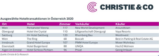 Wien. Nach einem absoluten Rekordjahr 2019, in dem in Österreich Hotels im Wert von mehr als 1,25 Mrd. Euro verkauft wurden, waren auch die Vorzeichen im ersten Quartal 2020 sehr positiv. Doch dann kam alles anders. Nach einem deutlichen Rückgang des Transaktionsvolumens durch Covid-19 in H1 2020 mit einem Hotelinvestmentvolumen von etwas über 60 Millionen Euro, gab es in der zweiten Jahreshälfte etwas mehr Bewegung. So konnte das Hotelinvestmentjahr mit einem stabilen Transaktionsvolumen von etwa 280 Millionen Euro abgeschlossen werden, sagen die Hotelimmobilienexperten bei Christie & Co.