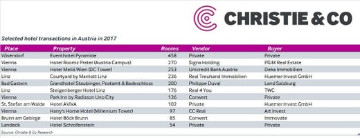 After a quiet first half of the year in which the Austrian hotel transaction volume was just €130 million, the pace picked up in the second half of the year and hotel transactions topped half a billion Euros in 2017. Due to the small number of hotels on the market, demand has shifted towards the purchase of development projects according to specialist hotel property adviser, Christie & Co.