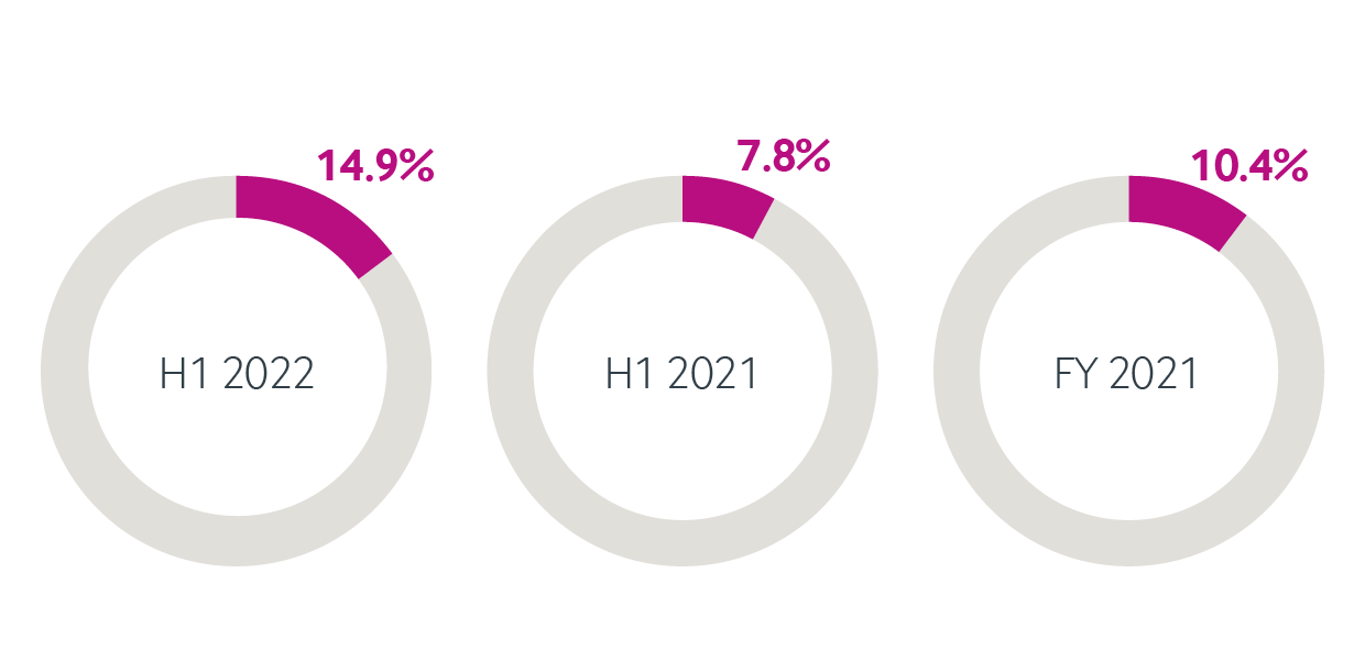 Across the North East and Midlands, sales increased by 54.2% in H1 2022, compared to the same period in 2021, which is largely being driven by more available debt funding and liquidity. The number of businesses coming to the market is still not enough to satisfy the level of increased buyer demand and values held up well as a result.